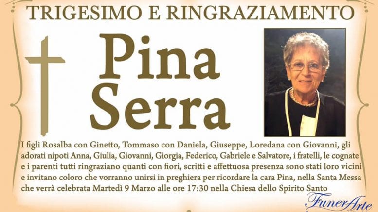 I figli Rosalba con Ginetto, Tommaso con Daniela, Giuseppe, Loredana con Giovanni, gli adorati nipoti Anna, Giulia, Giovanni, Giorgia, Federico, Gabriele e Salvatore, i fratelli, le cognate e i parenti tutti ringraziano quanti con fiori, scritti e affettuosa presenza sono stati loro vicini e invitano coloro che vorranno unirsi in preghiera per ricordare la cara Pina, nella Santa Messa che verrà celebrata martedì 9 marzo alle ore 17:30 nella chiesa dello Spirito Santo a Porto Torres.