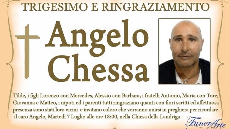 Tilde, i figli Lorenzo con mercedes, Alessio con Barbara, i fratelli Antonio, Maria con Tore, Giovanna e Matteo, i nipoti ed i parenti tutti ringraziano quanti con fiori, scritti ed affettuosa presenza sono stati loro vicini e invitano coloro che vorranno unirsi in preghiera per ricordare il caro Angelo, martedì 7 luglio alle ore 18 nella chiesa della Landrigga.