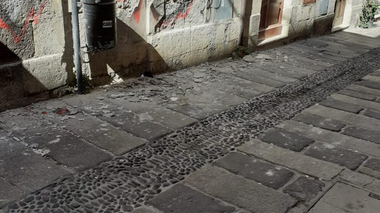Caduta calcinacci, questa mattina, in via Turritana a Sassari. All’altezza delle 4 cantonate, alcuni pezzi di intonaco si sono staccati poco lontano dal negozio di frutta e bar.