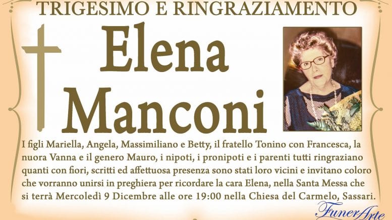 I figli Mariella, Angela, Massimiliano e Betty, il fratello Tonino con Francesca, la nuora Vanna e il genero Mauro, i nipoti, i pronipoti e i parenti tutti ringraziano quanti con fiori, scritti ed affettuosa presenza sono stati loro vicini e invitano coloro che vorranno unirsi in preghiera per ricordare la cara Elena, nella Santa Messa che si terrà mercoledì 9 dicembre alle ore 19 nella chiesa del Carmelo a Sassari.