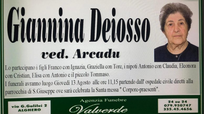 I funerali avranno luogo giovedì 13 agosto alle ore 11:15 partendo dall’ospedale civile di Alghero diretti alla parrocchia di San Giuseppe (Alghero) ove sarà celebrata la Santa Messa “corpore praesenti”.