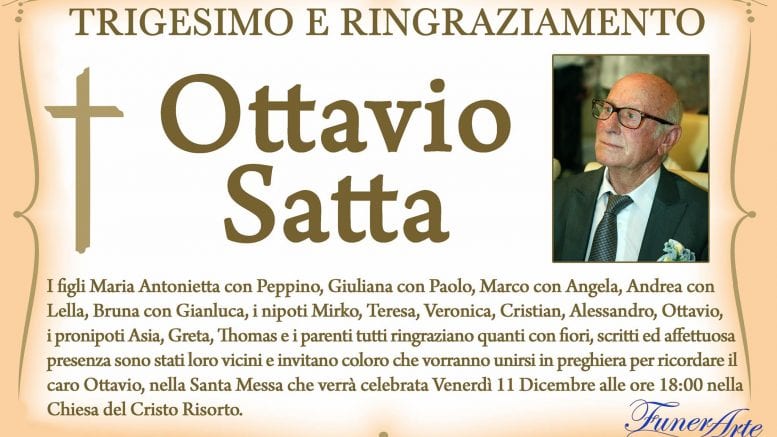 I figli Maria Antonietta con Peppino, Giuliana con Paolo, Marco con Angela, Andrea con Lella, Bruna con Gianluca, i nipoti Mirko, Teresa, Veronica, Cristian, Alessandro, Ottavio, i pronipoti Asia, Greta, Thomas e i parenti tutti ringraziano quanti con fiori, scritti ed affettuosa presenza sono stati loro vicino e invitano coloro che vorranno unirsi in preghiera per ricordare il caro Ottavio, nella Santa Messa che verrà celebrata venerdì 11 dicembre alle ore 18 nella chiesa del Cristo Risorto a Porto Torres.