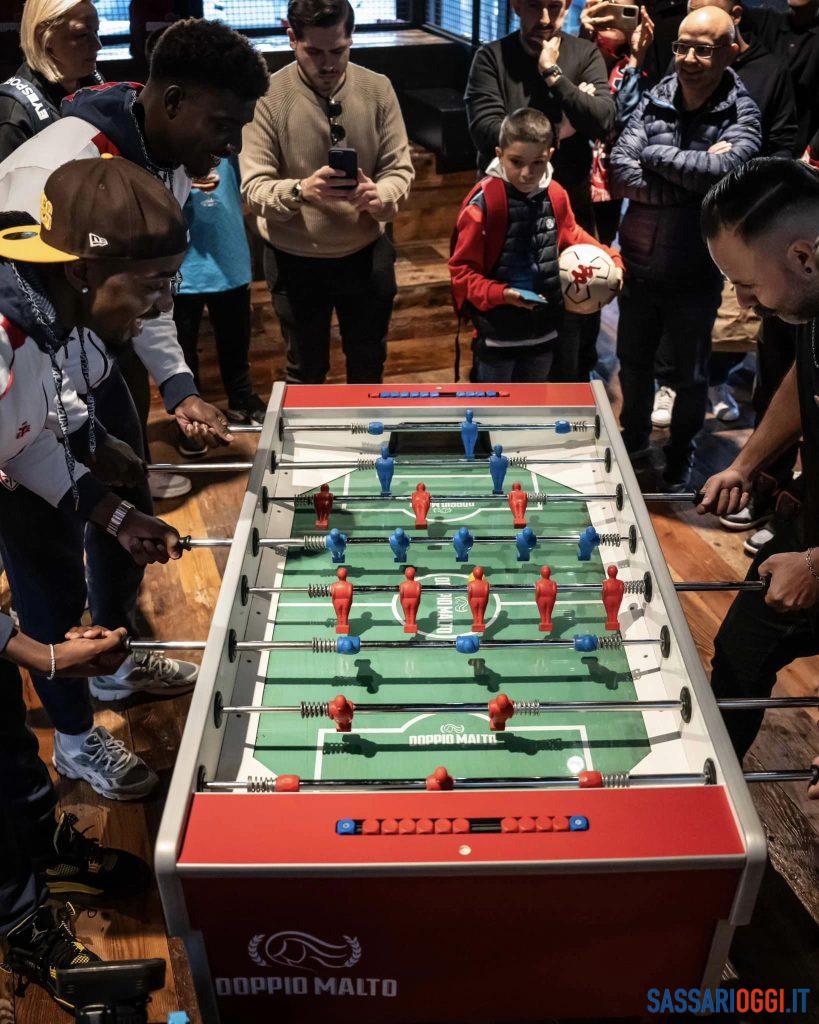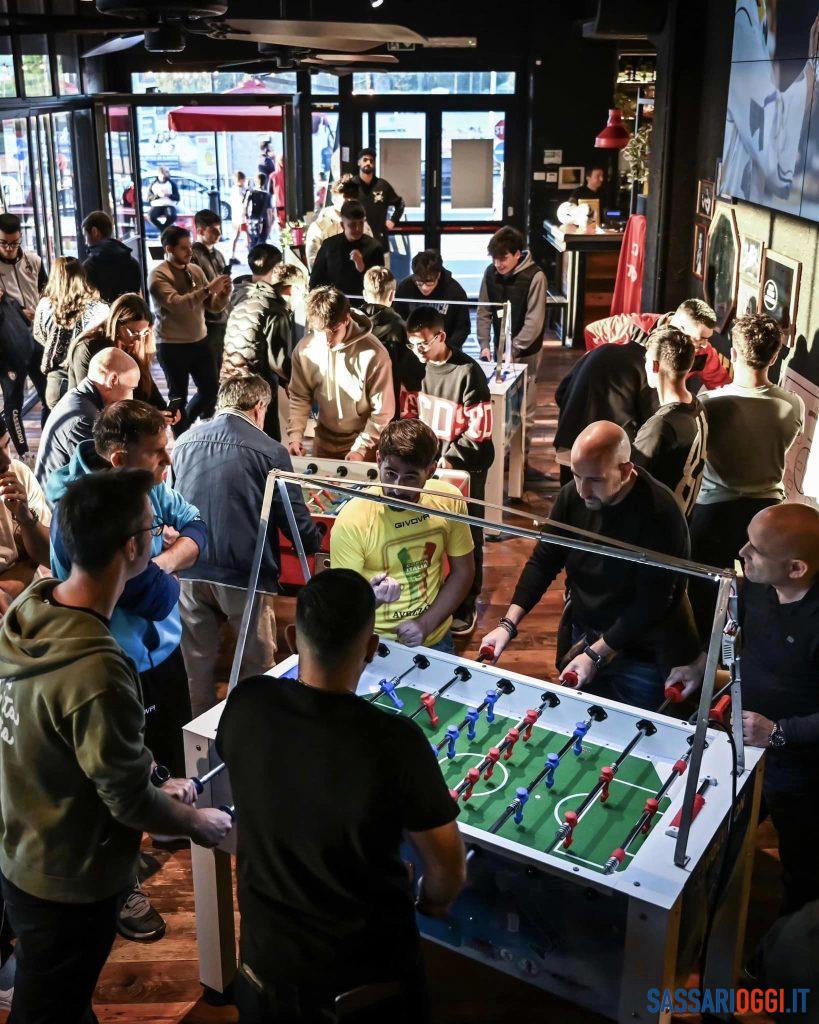 Pienone di tifosi per la prima tappa del calcio Balilla coi calciatori del Cagliari nel locale Doppio Malto di Alghero.