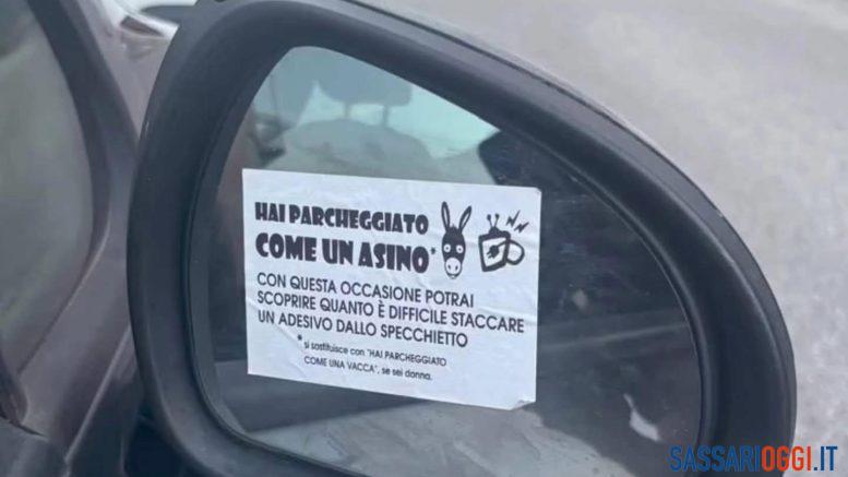 Questo nuovo eroe agisce con precisione chirurgica. Quando scova un’auto parcheggiata male, non si arrabbia. Non chiama i vigili. Non scrive post infuocati sui social. Semplicemente attacca un adesivo sullo specchietto dell’auto. Il messaggio? Diretto, ironico e decisamente poco elegante: “asino” o “vacca idiota“.