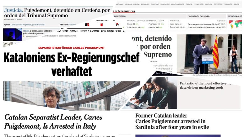 Il principale quotidiano spagnolo El Paìs apre con l’arresto: Puigdemont, detenido en Cerdeña por orden del Tribunal Supremo (Puigdemont, arrestato in Sardegna per ordine del Tribunale Supremo). Segue El Mundo, che titola: Justicia. Puigdemont, detenido en Cerdeña por orden del Tribunal Supremo (Giustizia. Puigdemont, arrestato in Sardegna per ordine del Tribunale Supremo). Poi La Vanguardia: Puigdemont, detenido en Italia por orden del Supremo (Puigdemont, detenuto in Italia per ordine del Supremo). E ancora El Correo: Puigdemont, detenido en Cerdeña por orden del Tribunal Supremo (Puigdemont, arrestato in Sardegna per ordine del Tribunale Supremo).