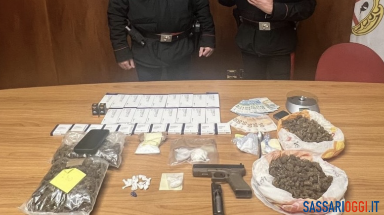 I militari di Sassari avevano notato movimenti anomali, così sono intervenuti perquisendo l’appartamento. Effettivamente il giovane è stato trovato in possesso di 158 grammi di cocaina, 655 grammi dimarijuana, 25 confezioni di sostanze dopanti vietate, un una bomba carta, di una pistola a gas, priva del tappo rosso, e della somma in contanti pari a 625 euro ritenuta verosimile provento attività illecita di spaccio, oltre a vario materiale utilizzato per il confezionamento. Lo stupefacente, il denaro e tutto il materiale sono stati sottoposti a sequestro mentre l’ordigno esplosivo è stato distrutto mediante attivazione diretta dai Carabinieri del Nucleo Artificieri del Nucleo Investigativo di Sassari e del Reparto Territoriale di Olbia.