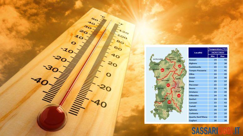Secondo le previsioni dell’Arpas lunedì a Sassari la massima sarà di 42 gradi, a Castelsardo sarà 41 e Ozieri 40. Secondo quei calcoli andrà ancora peggio in Gallura perché a Olbia sono previsti 45 gradi. Da martedì l’arrivo del maestrale dovrebbe spazzare via il caldo torrido dalla Sardegna. Secondo le previsioni di 3BMeteo a Sassari potrebbe andare pure peggio: “Durante la giornata di dopodomani la temperatura massima registrata sarà di 45 gradi“