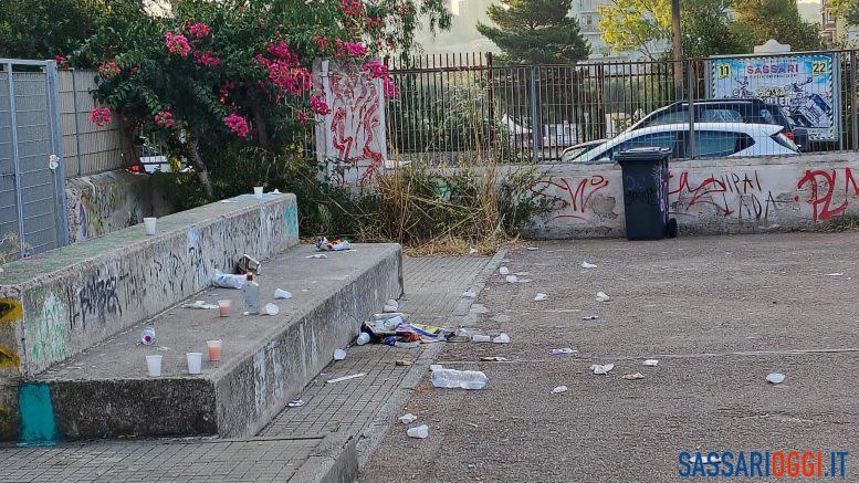 Durante le ore notturne, il campo di Sassari si riempie di persone che consumano alcol, fanno schiamazzi e compiono atti di vandalismo. Questa situazione rende difficile fruire di uno spazio pensato per il benessere e la socialità. La scena visibile nella foto mostra chiaramente il livello di incuria e abbandono che si trova di giorno.