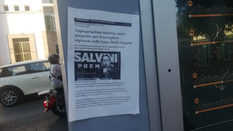 Nel frattempo, a Sassari, alcuni volantini sono comparsi contro il vice commissario leghista, Dario Giagoni. Nelle locandine, affisse in diverse parti della città, si ripercorre la vicenda giudiziaria che lo ha portato alla prescrizione. Giagoni, infatti, fu accusato di essersi impadronito di arredi e materiale vario di un locale di Santa Teresa.