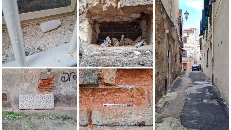 “Qui la si spaccia anche in pieno giorno”, si afferma senza paura di smentita. Chi presidia la zona indica le vedette che, ad ogni angolo, tra vicoli e traverse, segnalano il “pericolo” forze dell’ordine. Le sostanze più vendute sono cocaina ed eroina, le cui tracce sono peraltro sparse ovunque. Siringhe in via Ziu Cesaru, boccette di metadone disseminate in ogni anfratto, materassi con macchie di sangue. Bucarsi di nascosto, d’altra parte, in queste aree è facile: l’illuminazione è praticamente assente. E sono proprio le luci che si richiedono come misura prioritaria al centro storico insieme a un censimento delle abitazioni dove in tanti, soprattutto extracomunitari, si accumulano in tuguri invivibili. Sul discorso stranieri si tocca un nervo scoperto. “La parte destra del corso Vittorio Emanuele in discesa è loro appannaggio.”, svelano i residenti intendendo, soprattutto, nigeriani e ghanesi.