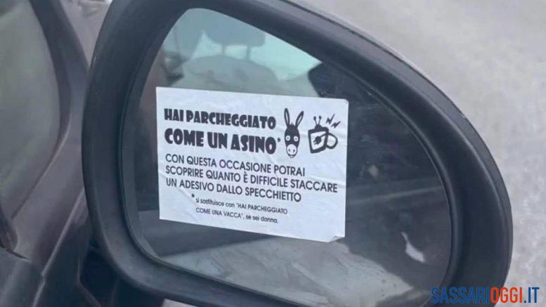 Il suo bersaglio? Le auto parcheggiate male. Marciapiedi bloccati, passi carrabili ostruiti, incroci invasi. Lui non urla. Non discute. Non scrive post polemici. Agisce in silenzio. Raggiunge l’auto e piazza un adesivo sullo specchietto. Niente frasi gentili. Solo parole dirette e pungenti: “asino”, “vacca idiota”, “educato altrove”.