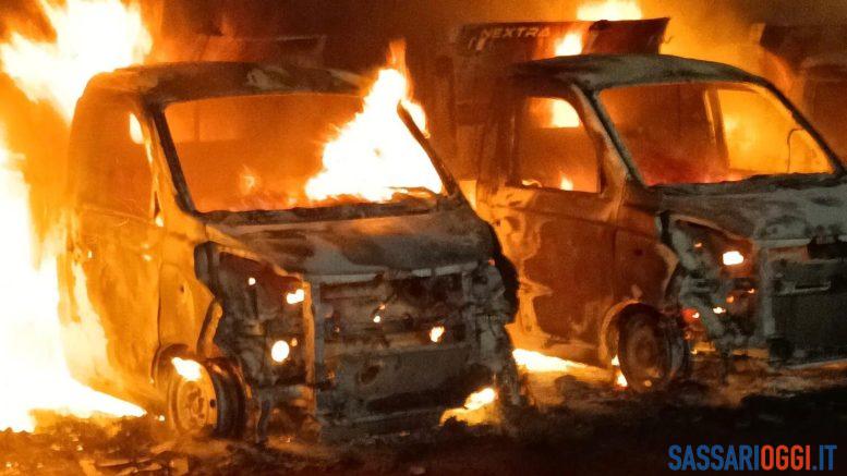 L’incendio ha distrutto i camion dei rifiuti a Porto Torres.
