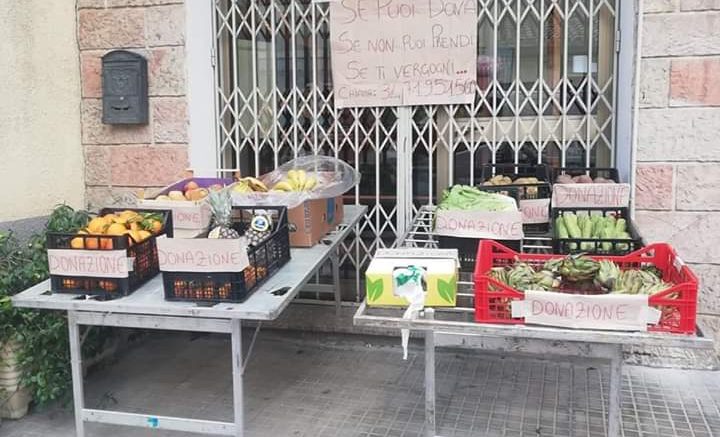 “Se puoi dona, se non puoi prendi, se ti vergogni chiama”. Un messaggio che vale più di mille parole ed un cartello appeso all’esterno del frutta e verdura di Domenico ad Oschiri. Mentre l’emergenza coronavirus sta facendo sentire il volto della crisi più vera, quella di non riuscire a mettere il pranzo e la cena in tavola, proseguono le iniziative di solidarietà.