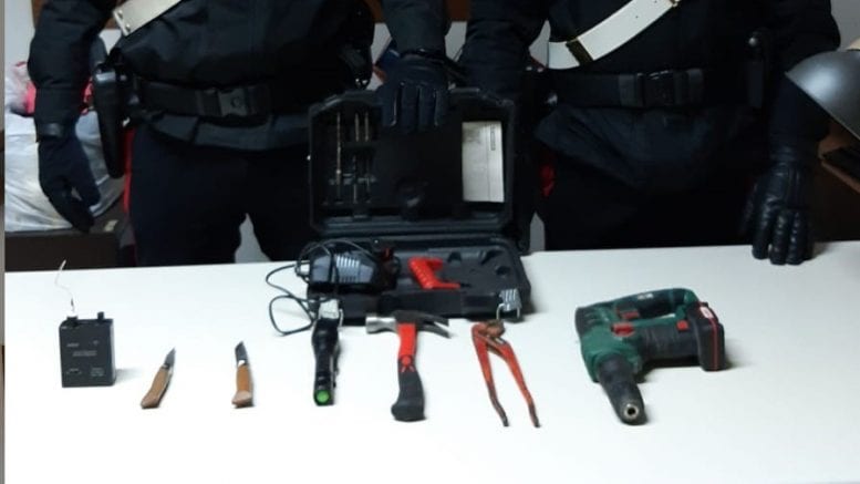 Dopo aver avuto contezza delle persone che vi erano a bordo, hanno effettuato una perquisizione personale e veicolare, rinvenendo numerosi attrezzi per l’effrazione, fotocellule e un “jammer” ovvero un dispositivo utilizzato per il disturbo delle radio frequenze, come ad esempio le allarmi delle autovetture o delle abitazioni. Sia l’evaso che un cittadino di nazionalità tunisina sono stati anche denunciati perché trovati in possesso di un coltello a serramanico, per il quale è vietato il porto.