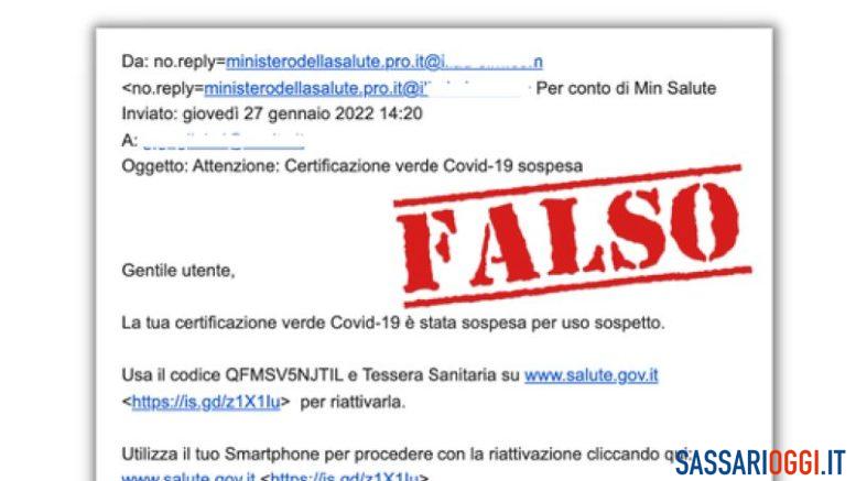 Stanno circolando, anche in provincia di Sassari, email false da un mittente che si finge il ministero della Salute. Se hai ricevuto un’email con oggetto “Attenzione: Certificazione verde Covid-19 sospesa“, inviata da “ministerodellasalute.pro.it”, non proviene dal ministero della Salute, ma si tratta di un tentativo di phishing.