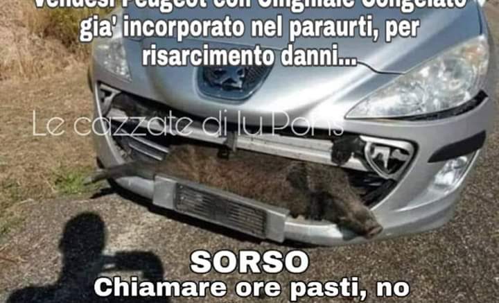 Ma gira anche l’immagine di una Peugeot in vendita: “Vendesi Peugeot con cinghiale congelato già incorporato nel paraurti, per risarcimento danni… Sorso… Chiamare ore pasti, no perditempo”.