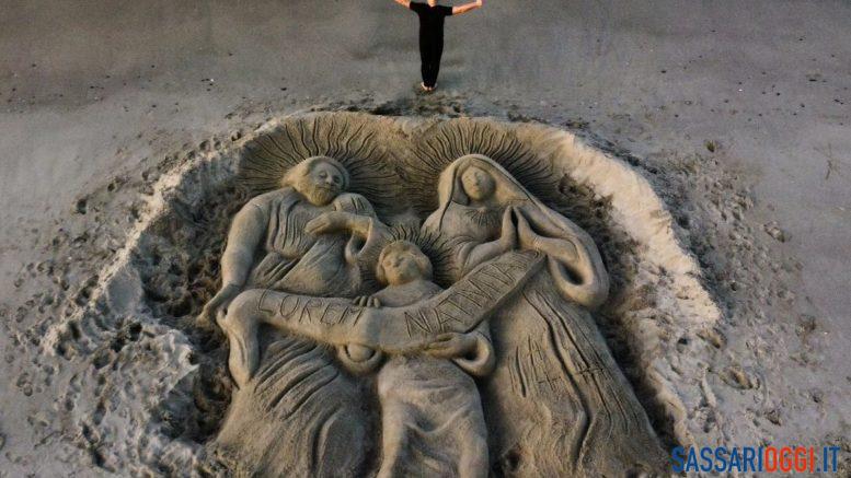 Per Natale Nicola Urru ha realizzato una nuova scultura sulla sabbia di Platamona: la famiglia simbolo del presepe. L’artista specializzato in opere sul litorale sassarese oggi ha scelto come tema il Natale e la famiglia.