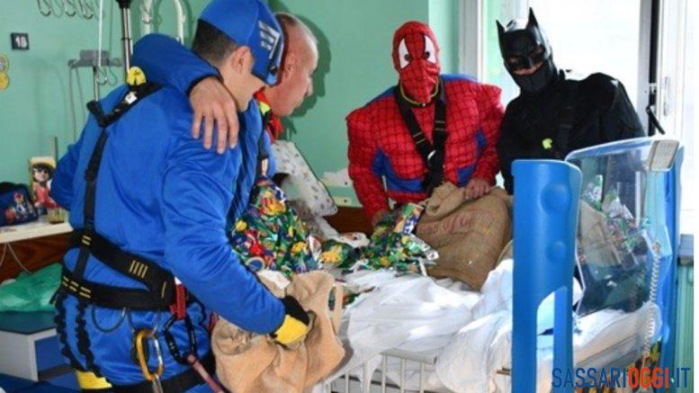Grazie all’intervento del reparto Saf (Speleo Alpino Fluviale) e alla gru autoscala, i vigili del fuoco mascherati da supereroi della DC Comics e della Marvel, Batman e Superman, si sono calati dalle finestre della biblioteca della Pediatria, diretta dal dottor Gianfranco Meloni, portando sacchi colmi di uova preparate dall’associazione “Gianni Fresu”. Poco dopo, Spiderman e Captain America hanno raggiunto i colleghi‑eroi, suscitando stupore e sorrisi. Nel reparto di Neuropsichiatria Infantile, diretto dal professor Stefano Sotgiu, i quattro vigili del fuoco mascherati si sono calati dal tetto per fare “irruzione” in punta di piedi!