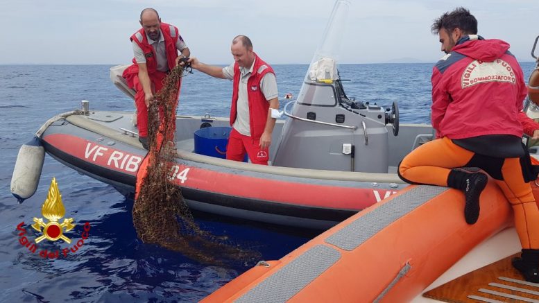 Il nucleo sommozzatori del comando dei Vigili del Fuoco di Sassari durante un addestramento ha rinvenuto abbandonata nelle acque del golfo, una rete da posta di circa 25 metri che giaceva su una secca regolarmente frequentata da appassionati di subacquea e apneisti, impigliata nella roccia che costituiva un pericolo per le attività subacquee.