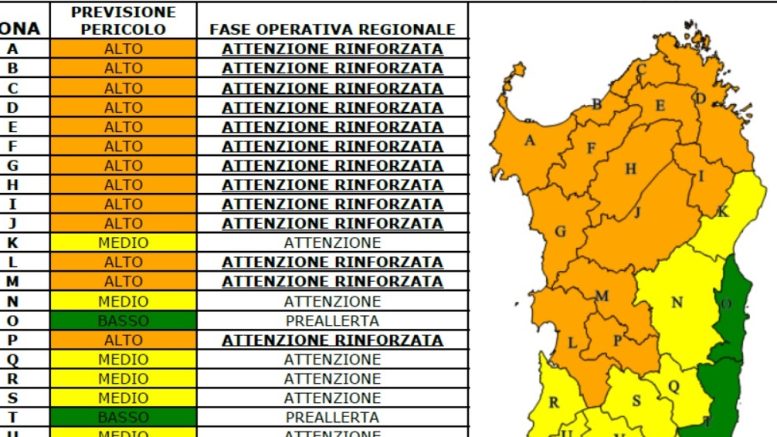 Nuovo bollettino di allerta incendi della Protezione civile che ha alzato il rischio ad arancione con attenzione rinforzata per il Sassari e il nord Sardegna.