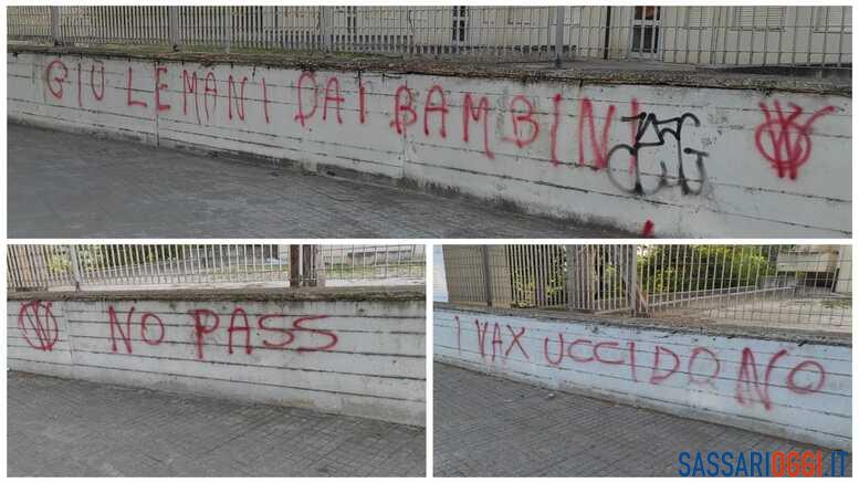 Da alcune settimane, a Sassari, le scritte no vax continuano a campeggiare sul muro esterno della scuola di via Cilea, nel quartiere di Latte Dolce. “Giù le mani dai bambini“, si legge nella scritta realizzata con una bomboletta spray rossa e accompagnata dal classico logo di una VV chiusa nel cerchio. Pochi passi più avanti le scritte proseguono un “No Pass” a caratteri cubitali e la frase delirante “I vax uccidono“.