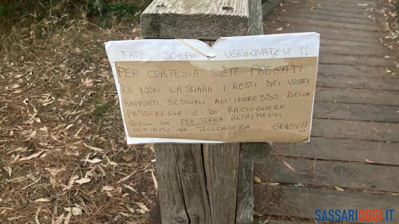Lo stagno di Platamona non sempre è frequentato dagli amanti della natura. Spesso è visitato da coppie focose, che lasciano per terra la sintesi delle loro effusioni. La presenza di fazzoletti di carta, ma anche preservativi e quant’altro, ha indotto un cittadino a lasciare un cartello inequivocabile. “Fate schifo, vergognatevi – esordisce il messaggio -. Per cortesia, siete pregati di non lasciare i resti dei vostri rapporti sessuali all’ingresso della passerella e di raccogliere quelli già per terra. Altrimenti mettiamo una telecamera. Grazie!”.