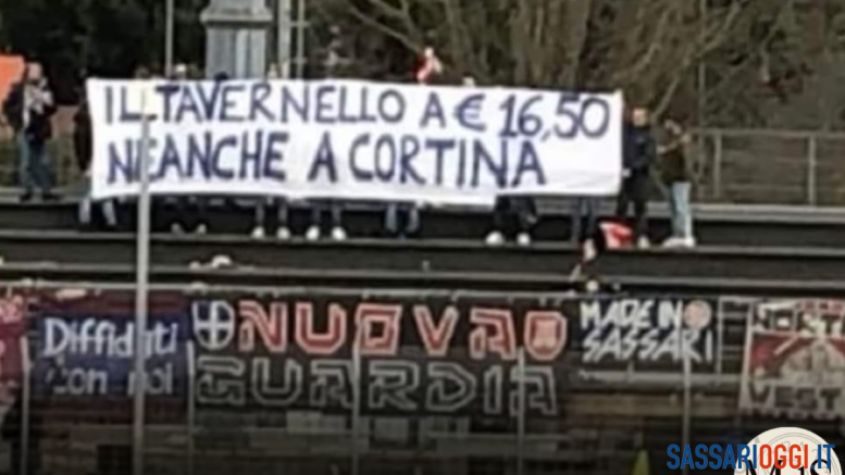 Striscione goliardico della Torres su Tavernello e prezzi dei biglietti