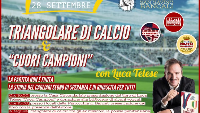 In mattinata, alle 10, presso la casa circondariale, il giornalista e volto noto della tv Luca Telese presenterà il suo libro dal titolo “Cuori campioni“. Sarà l’occasione per donare alla biblioteca alcuni volumi. Nel pomeriggio, alle 15, presso i locali della parrocchia di San Gavino martire, l’autore incontrerà i presenti per effettuare un ulteriore presentazione. A seguire il triangolare di calcio tra gli ex rossoblu, la polizia penitenziaria e i detenuti.