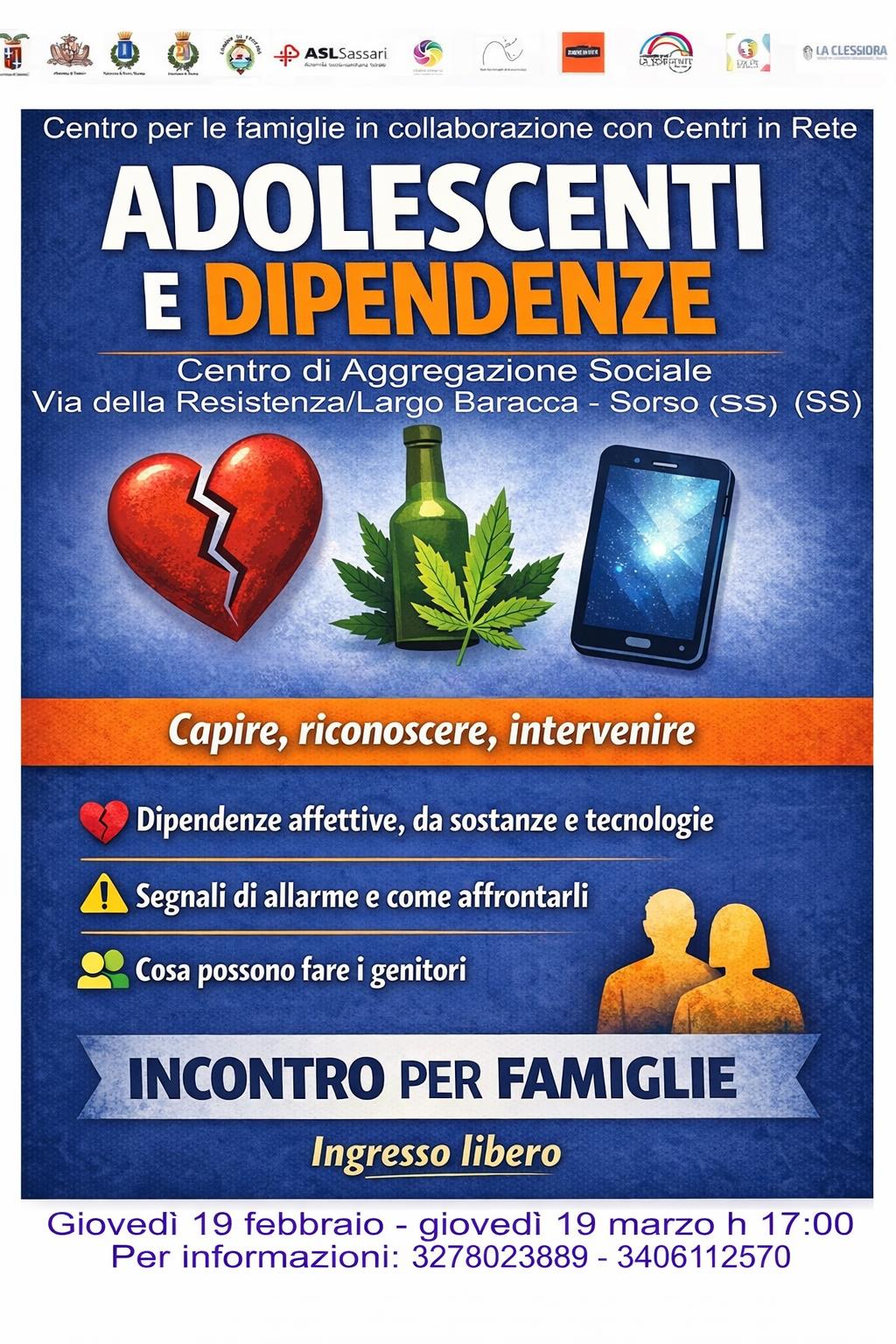L’adolescenza è una fase delicata, ricca di cambiamenti emotivi, relazionali e sociali. È proprio in questo periodo che possono emergere forme di dipendenza, affettive, da sostanze o legate alle tecnologie, spesso come risposta a fragilità, disagi o difficoltà di comunicazione. Comprendere questi fenomeni è il primo passo per riconoscerli e affrontarli in modo efficace. L’incontro è previsto il 19 febbraio alle ore 17 nel Centro di aggregazione via della Resistenza a Sorso.