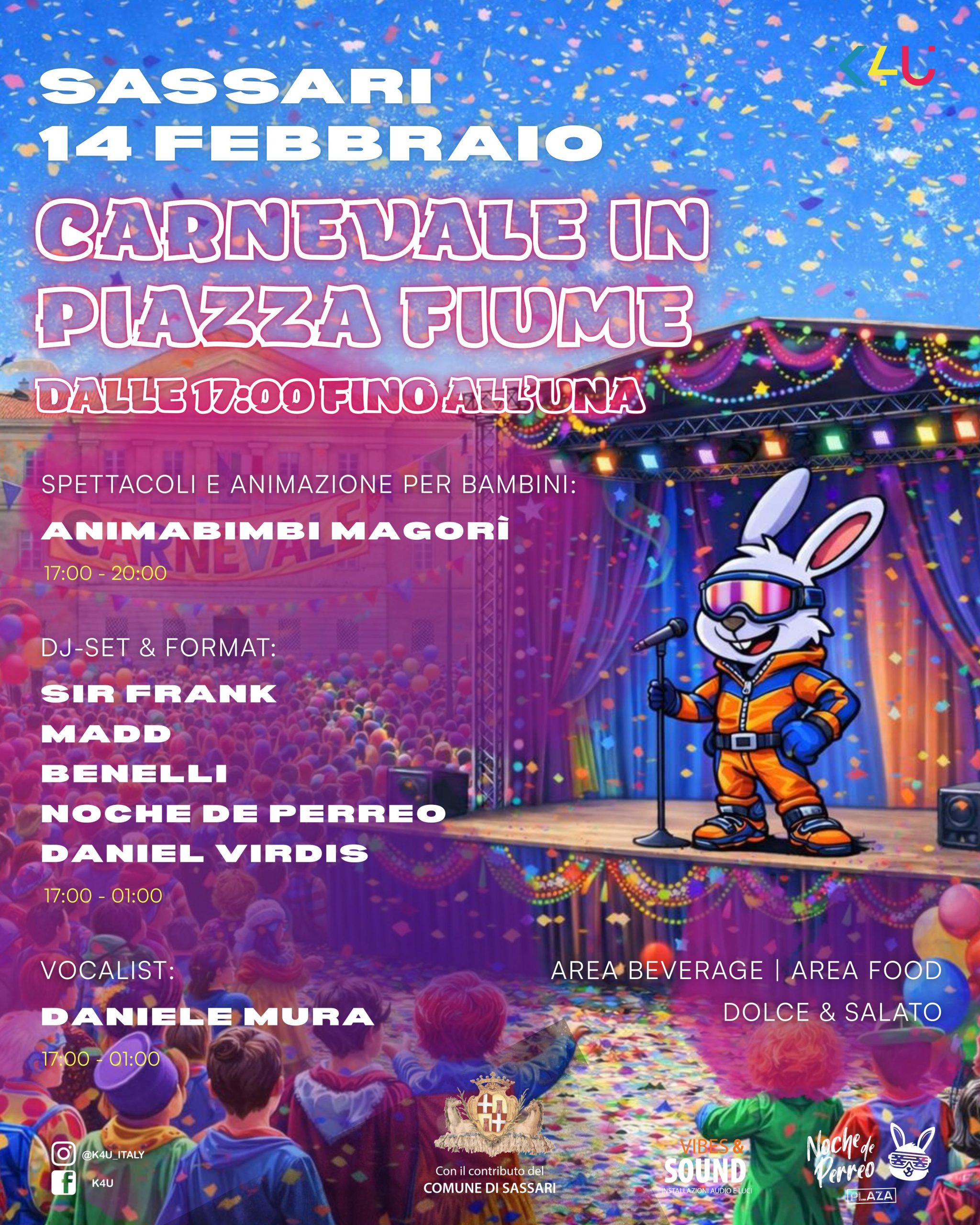 Sabato 14 febbraio, a partire dalle 17, Piazza Fiume a Sasari si anima per il Carnevale. Un appuntamento aperto a tutti, pensato per bambini, giovani, famiglie ed adulti, nel centro della città.