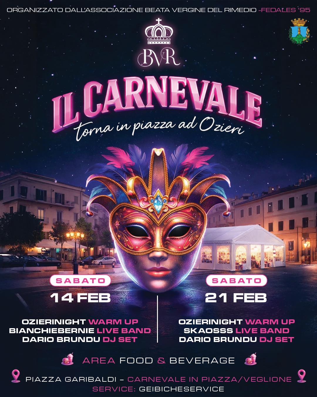 Dopo la grande sfilata dei carri allegorici, la festa continua nel cuore della città! Tutti in Piazza Garibaldi per vivere due serate di puro divertimento insieme ai ragazzi dell’Associazione della Beata Vergine del Rimedio – Fedales 95.