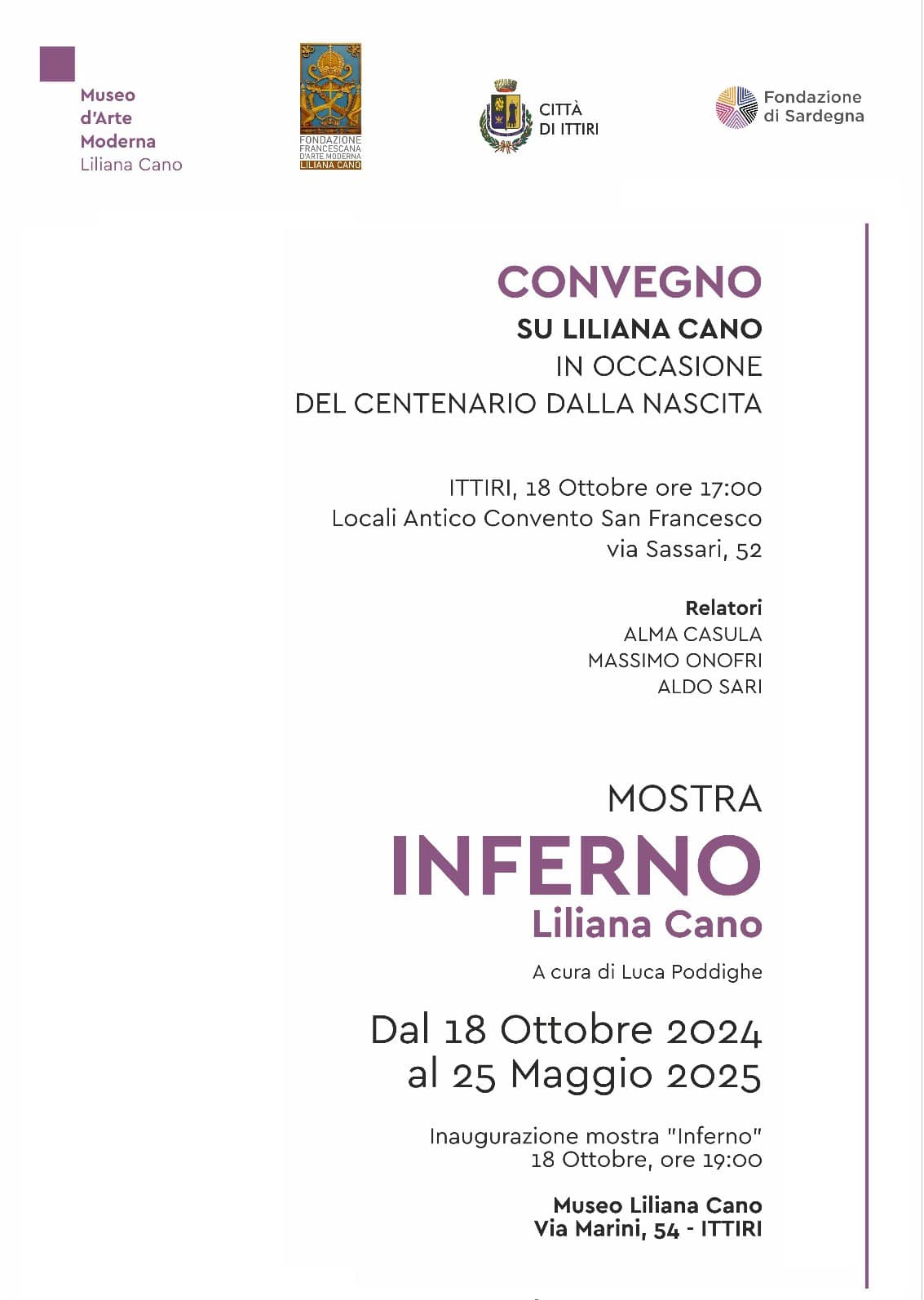 A seguire, alle 19:00, presso il Museo d’Arte Moderna Liliana Cano di Ittiri, verrà inaugurata la mostra INFERNO di Liliana Cano, a cura di Luca Poddighe, organizzata dal Museo d’Arte Moderna Liliana Cano e promossa dalla Fondazione Francescana di Arte Moderna Liliana Cano, dal Comune di Ittiri e dalla Fondazione Sardegna. La mostra sarà visitabili sino al 25 maggio.