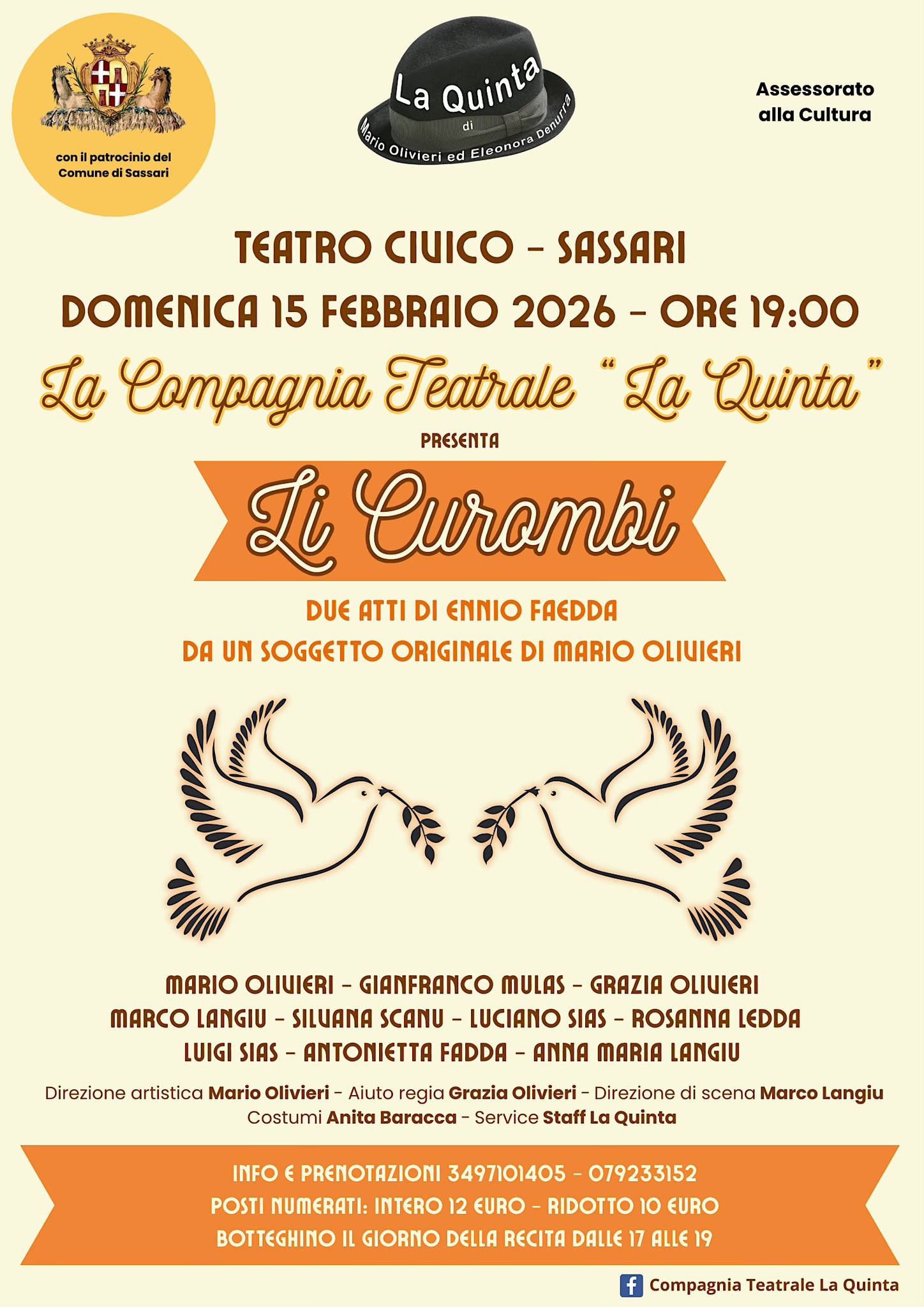 La Compagnia Teatrale “La Quinta” mette in scena la commedia “LI CUROMBI”, due atti di Mario Olivieri ed Ennio Faedda. DOMENICA 15 FEBBRAIO – ORE 19:00