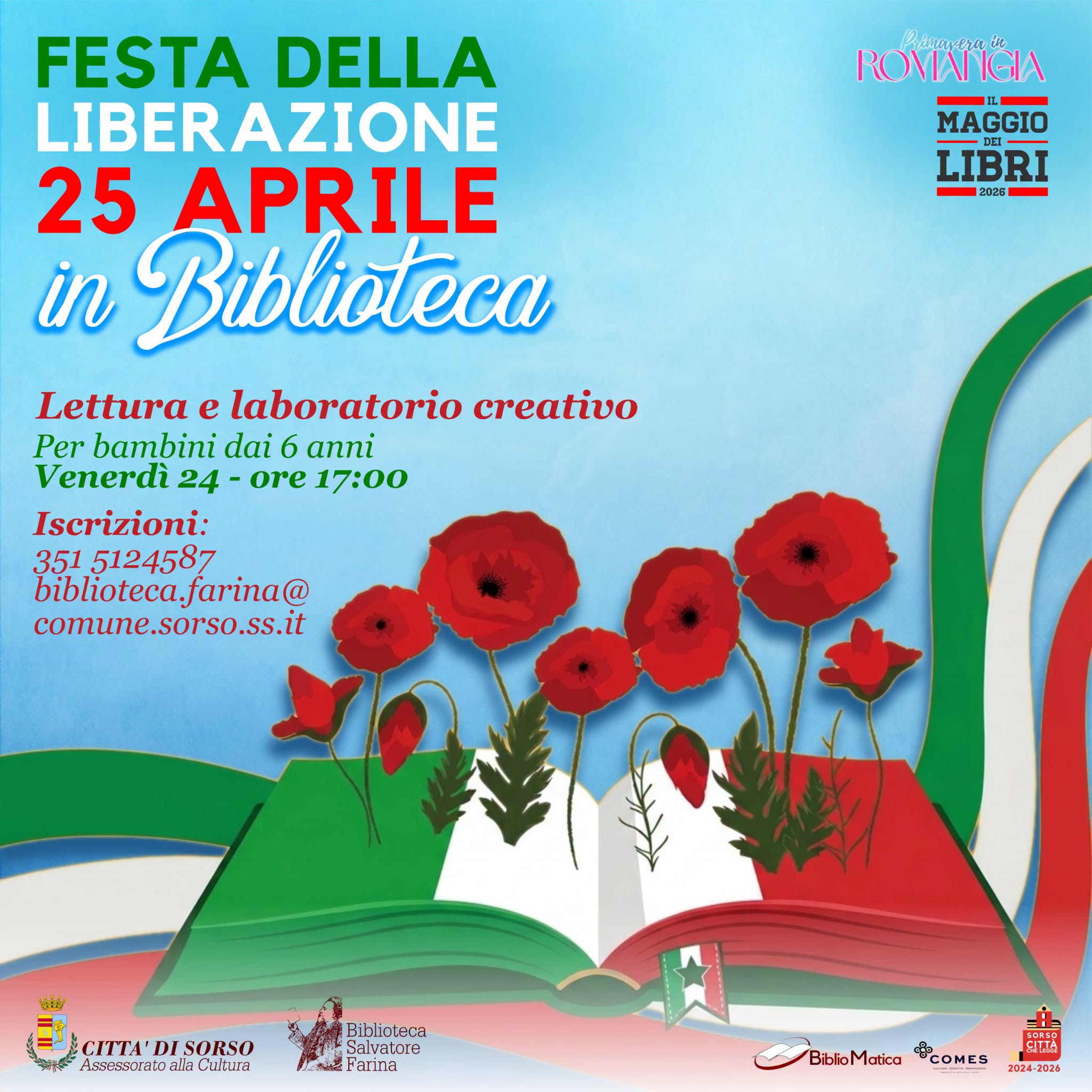 Festa della Liberazione il 25 aprile in Biblioteca a Sorso. In occasione del 25 Aprile, l’Assessorato alla Cultura del Comune di Sorso invita i più piccoli a un pomeriggio speciale dedicato alla memoria e alla creatività. All’interno della rassegna “Il Maggio dei Libri 2026”, la Biblioteca Salvatore Farina ospiterà un incontro di lettura e un laboratorio creativo per far conoscere ai bambini i valori di questa importante ricorrenza.