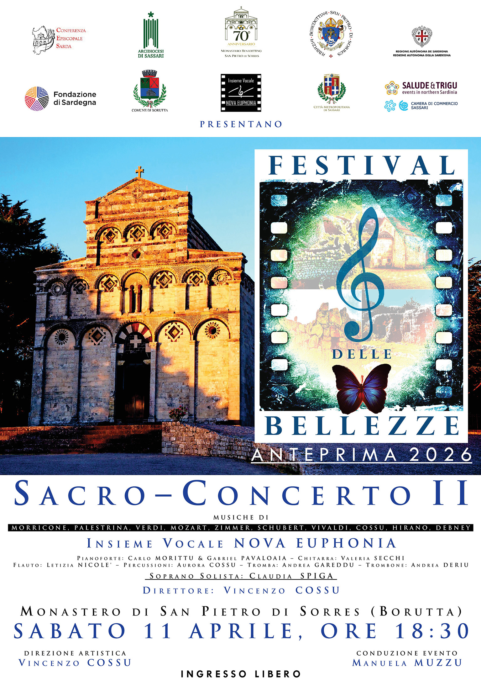 Il Festival delle Bellezze 2026 parte così dal monastero benedettino di San Pietro di Sorres. L‘Insieme Vocale Nova Euphonia proporrà un Sacro Concerto con musiche di Morricone, Palestrina, Verdi, Mozart, Zimmer, Schubert, Vivaldi, Cossu, Hirano e Debney. I solisti e coristi saranno diretti, come sempre, dal maestro Vincenzo Cossu e accompagnati dagli strumentisti Carlo Morittu e Gabriel Pavaloaia (pianoforte e tastiere), Valeria Secchi (chitarra acustica), Aurora Cossu (percussioni), Letizia Nicolè (flauto traverso), Andrea Careddu (tromba) e Andrea Deriu (trombone). Interverrà un’ospite speciale, il soprano Claudia Spiga, che canterà la parte solista nell’Ave Maria di Schubert.