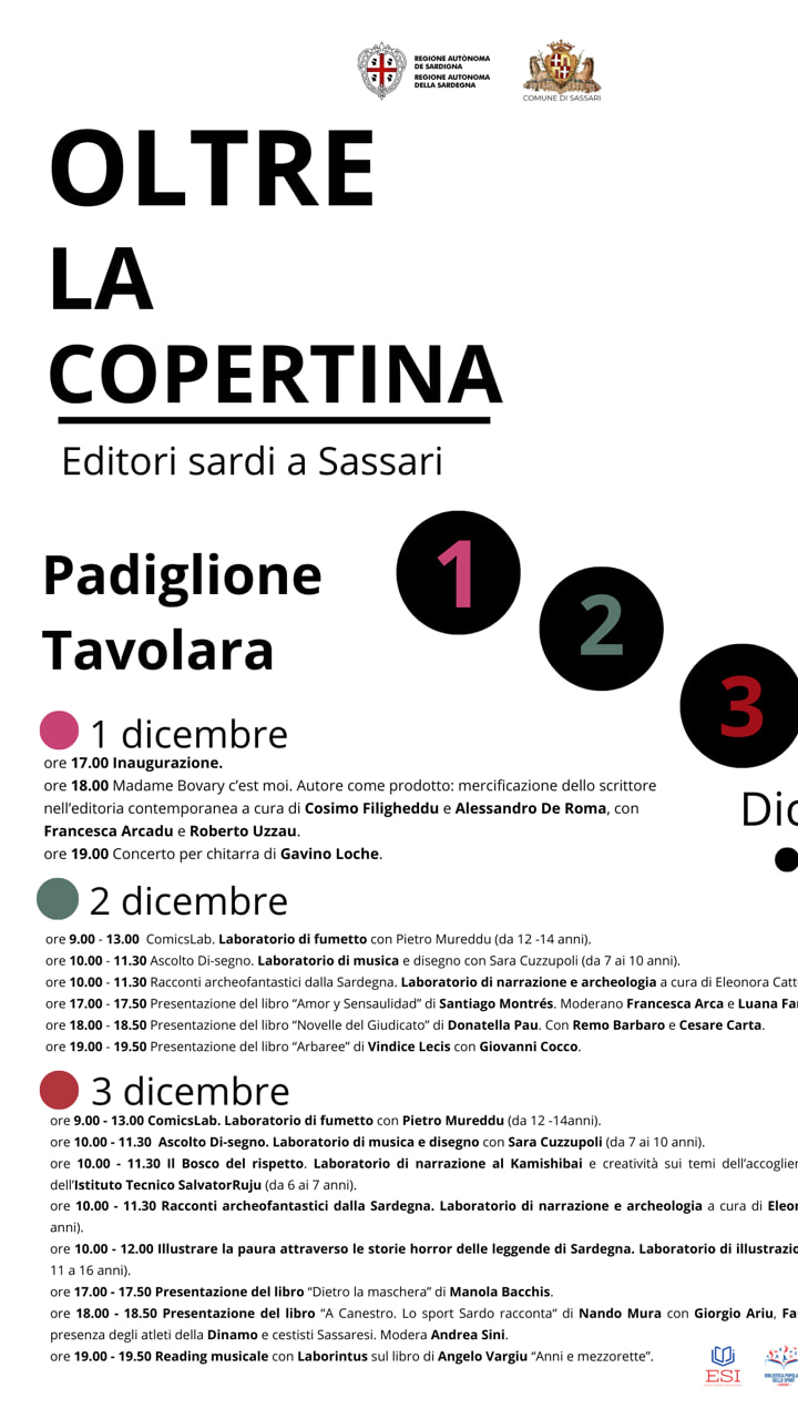 Dal 1° al 3 dicembre il Padiglione Tavolara diventerà il punto di riferimento per l’editoria dell’isola grazie a “Oltre la copertina”, la nuova fiera dedicata ai libri e alla produzione culturale sarda. L’evento, promosso dal Comune di Sassari con il supporto della Regione Sardegna, è organizzato dall’associazione Editori Sardi Indipendenti, dall’associazione Il Colombre e dalla Libreria Koinè. Tre giorni totalmente gratuiti, ricchi di incontri, laboratori, presentazioni e momenti artistici, pensati per valorizzare la varietà e la vivacità del panorama editoriale sardo.