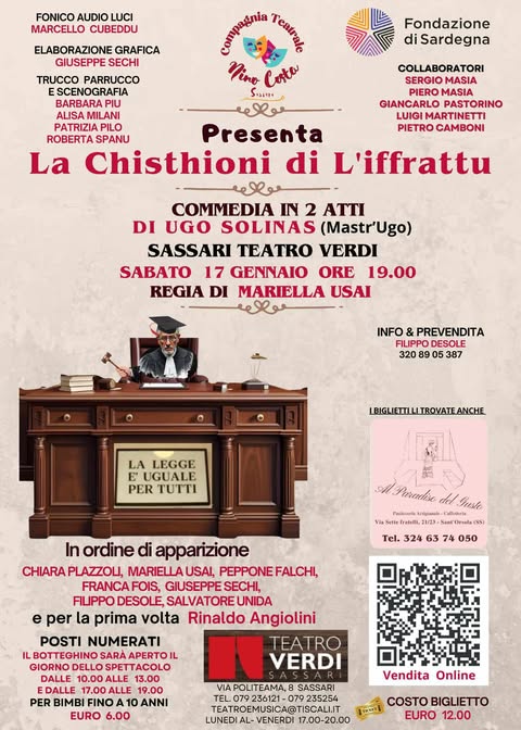 Una commedia brillante e pungente che affonda le radici nella tradizione teatrale sarda. “La Chistioni di L’iffrattu”, di Ugo Solinas (Mastr’Ugo), va in scena al Teatro Verdi di Sassari sabato 17 gennaio alle ore 19.00. Tra equivoci, ironia e personaggi memorabili, lo spettacolo mette in scena una disputa che diventa specchio della società, tra giustizia, potere e umanità. Con la regia di Mariella Usai e un cast affiatato, la commedia promette risate intelligenti e riflessione, mantenendo vivo il sapore autentico del teatro popolare.