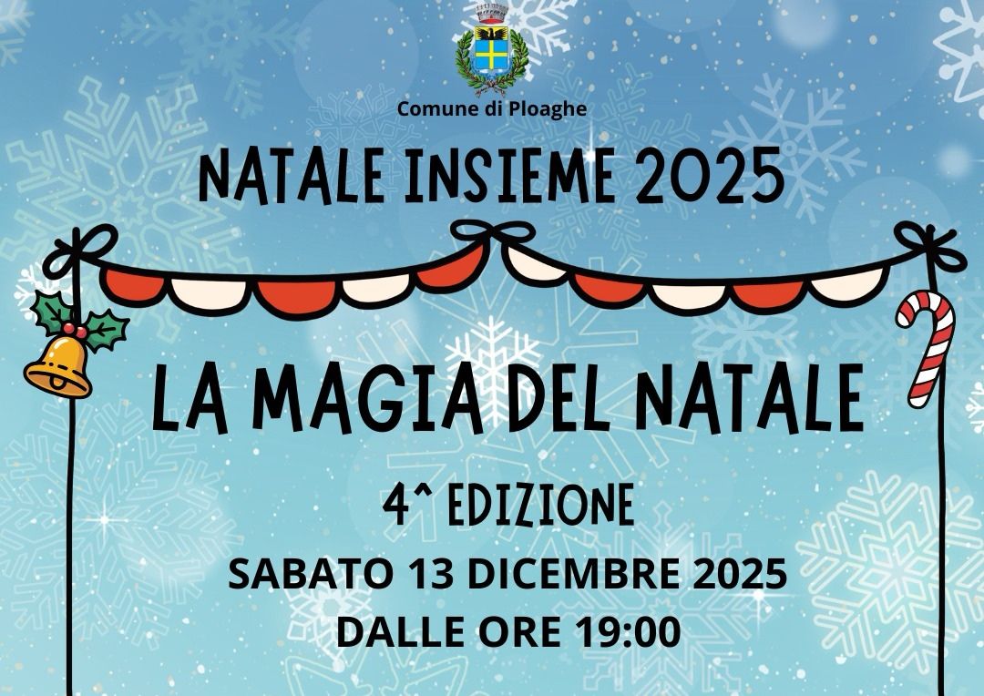 Il Natale è già alle porte Il Comune di Ploaghe, le Associazioni e i comitali locali, sabato 13 dicembre, organizzano la quarta edizione de “La Magia del Natale”: a partire dalle ore 19.00, vi aspettiamo numerosi per una serata di allegria e intrattenimento, musica e animazione per grandi e piccoli, con stand di prodotti tipici e artigiani tra il Corso Giovanni Spano e Piazza San Pietro. Lungo la via principale del paese, con le vetrine dei nostri commercianti vestite a festa, sarà possibile degustare ottimo cibo e immergersi nell’atmosfera magica del Natale