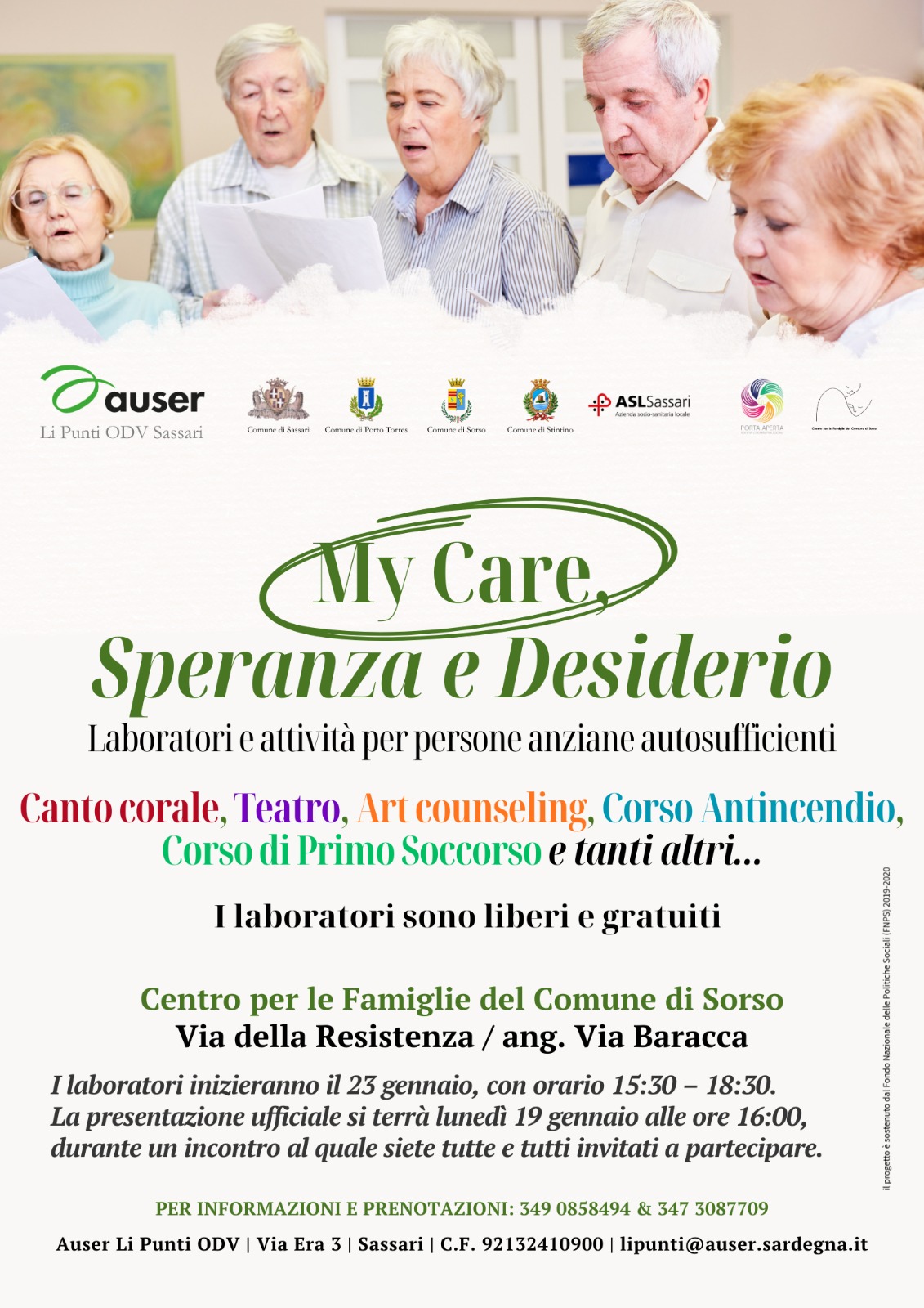 Il Centro per le Famiglie del Comune di Sorso, in collaborazione con Auser Li Punti ODV, organizza “My Care, Speranza e Desiderio”, laboratori e attività per persone anziane autosufficienti.