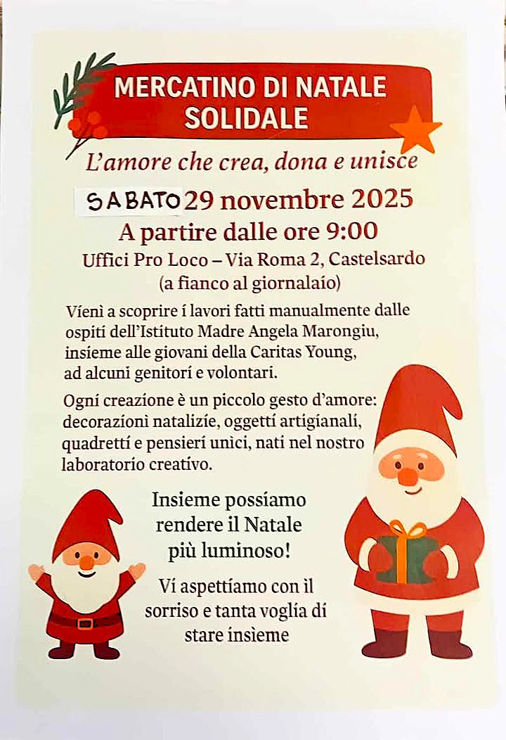 Sabato 29 novembre 2025, a partire dalle ore 9:00, presso gli Uffici Pro Loco in Via Roma 2 a Castelsardo (accanto al giornalaio), si terrà un mercatino natalizio speciale dedicato alla solidarietà e alla creatività.