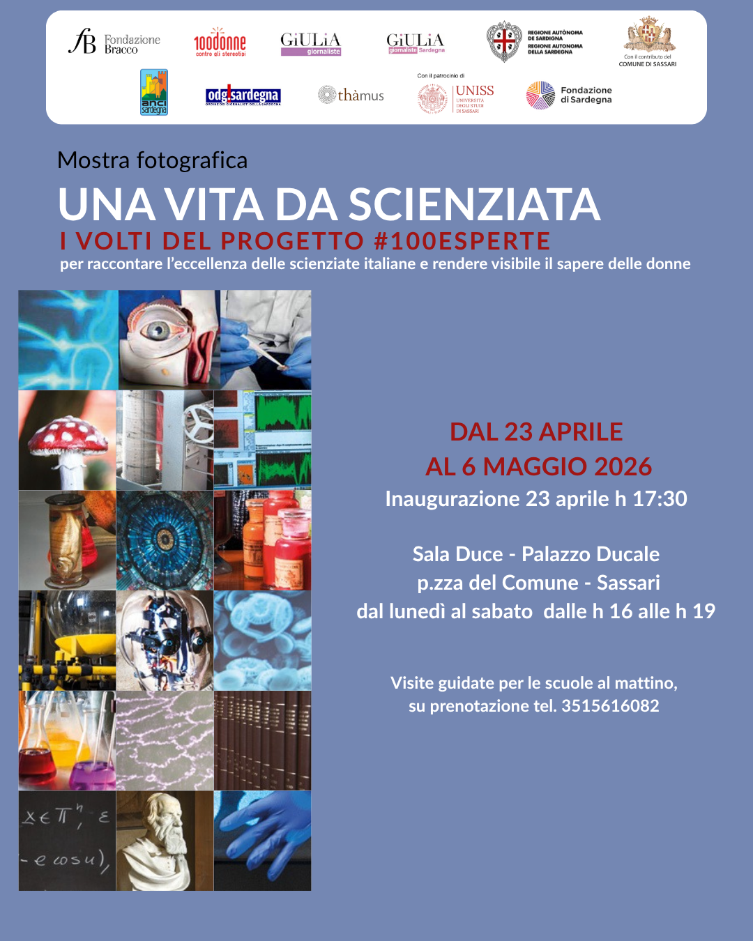 Giovedì 23 aprile, alle 17:30, nella Sala Duce del Palazzo Ducale di Sassari, in piazza del Comune, sarà inaugurata la mostra fotografica “Una vita da scienziata – I volti del progetto #100esperte”, realizzata dalla Fondazione Bracco e arrivata in Sardegna grazie all’impegno dell’associazione Giulia Giornaliste Sardegna, con il patrocinio della Regione Autonoma della Sardegna, del Comune di Sassari, dell’Università degli Studi di Sassari, di Anci Sardegna, dell’Ordine dei Giornalisti Sardegna e con il contributo della Fondazione di Sardegna. L’esposizione resterà a Sassari dal 23 aprile al 6 maggio 2026: sarà possibile visitarla dal lunedì al sabato, dalle ore 16:00 alle 19:00. Sono in programma, inoltre, visite guidate per le scuole: per informazioni a riguardo, è possibile chiamare il numero 3515616082.
