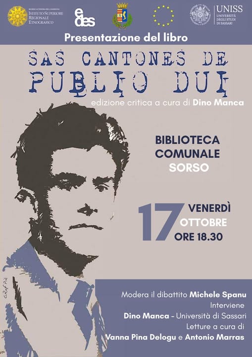 Venerdì 17 ottobre, alle 18:30, la Biblioteca comunale “Salvatore Farina” ospiterà la presentazione del volume “Sas Cantones de Publio Dui”, edizione critica a cura di Dino Manca.