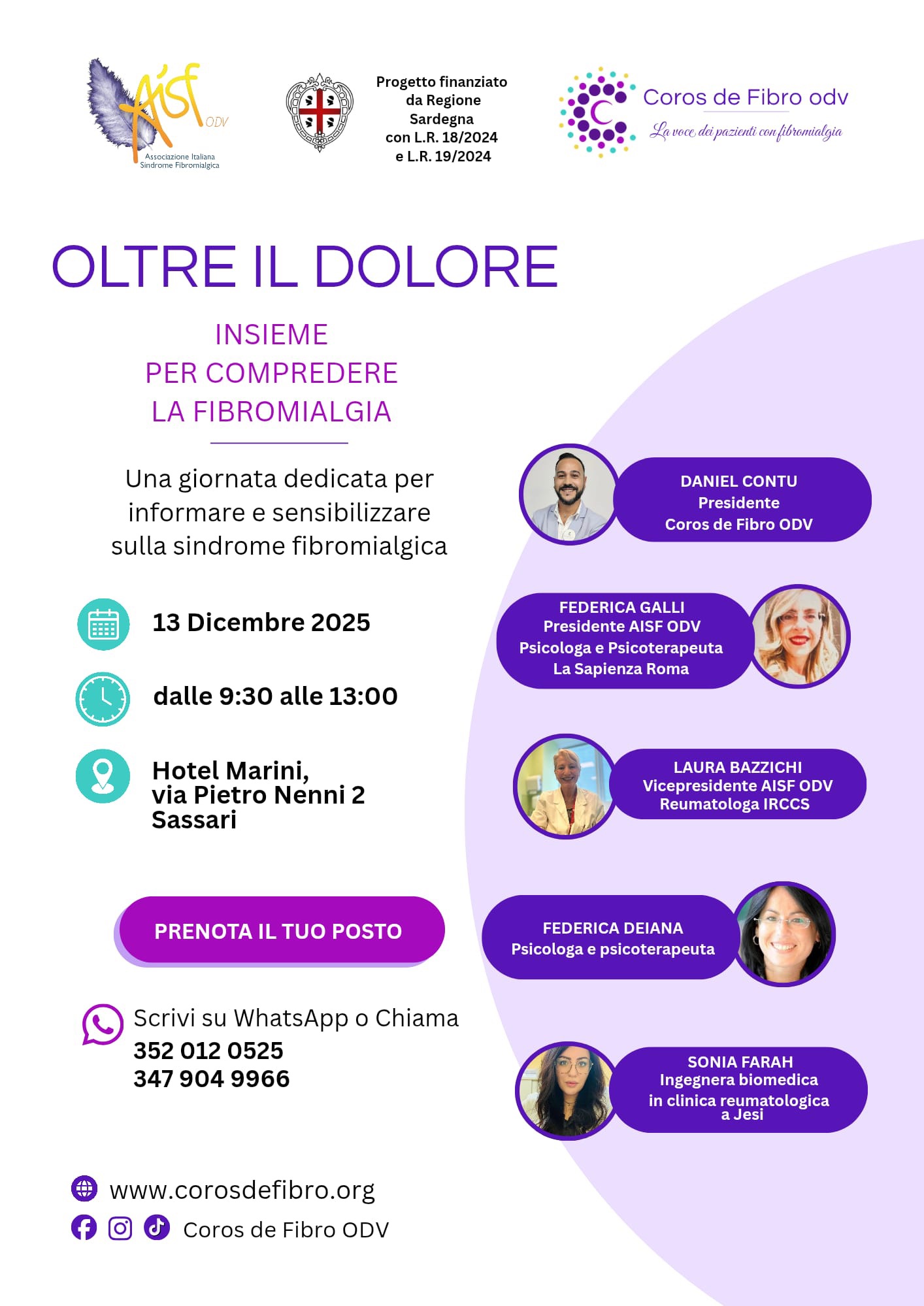 Una mattinata dedicata a informare, sensibilizzare e creare consapevolezza sulla sindrome fibromialgica, insieme a professionisti, esperti e associazioni impegnate quotidianamente al fianco dei pazienti. Sabato 13 dicembre ore 9-30 presso l’Hotel Marini.