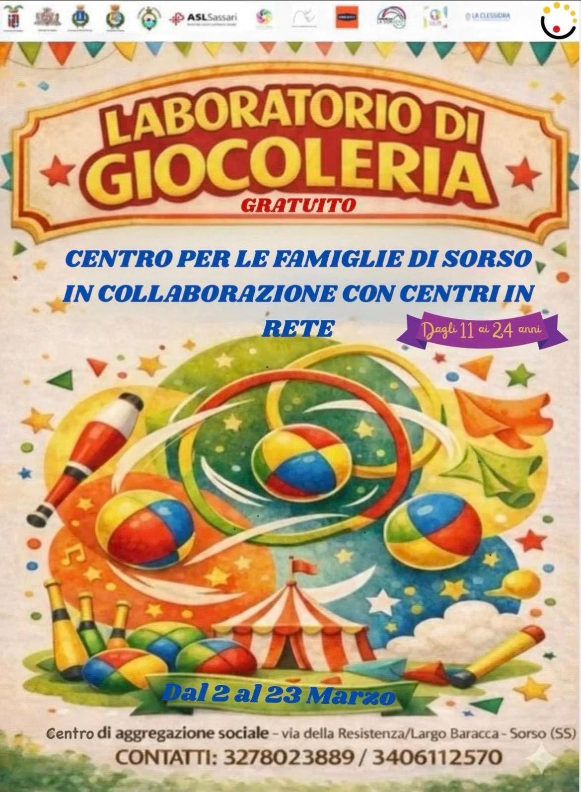 Al Centro per le Famiglie un laboratorio di Giocoleria: Al Centro per le Famiglie di Sorso, ogni lunedì, dal 2 al 23 marzo, dalle 16:00 alle 18:00, si terrà il laboratorio di Giocoleria, destinato ai ragazzi e alle ragazze dagli 11 ai 24 anni.