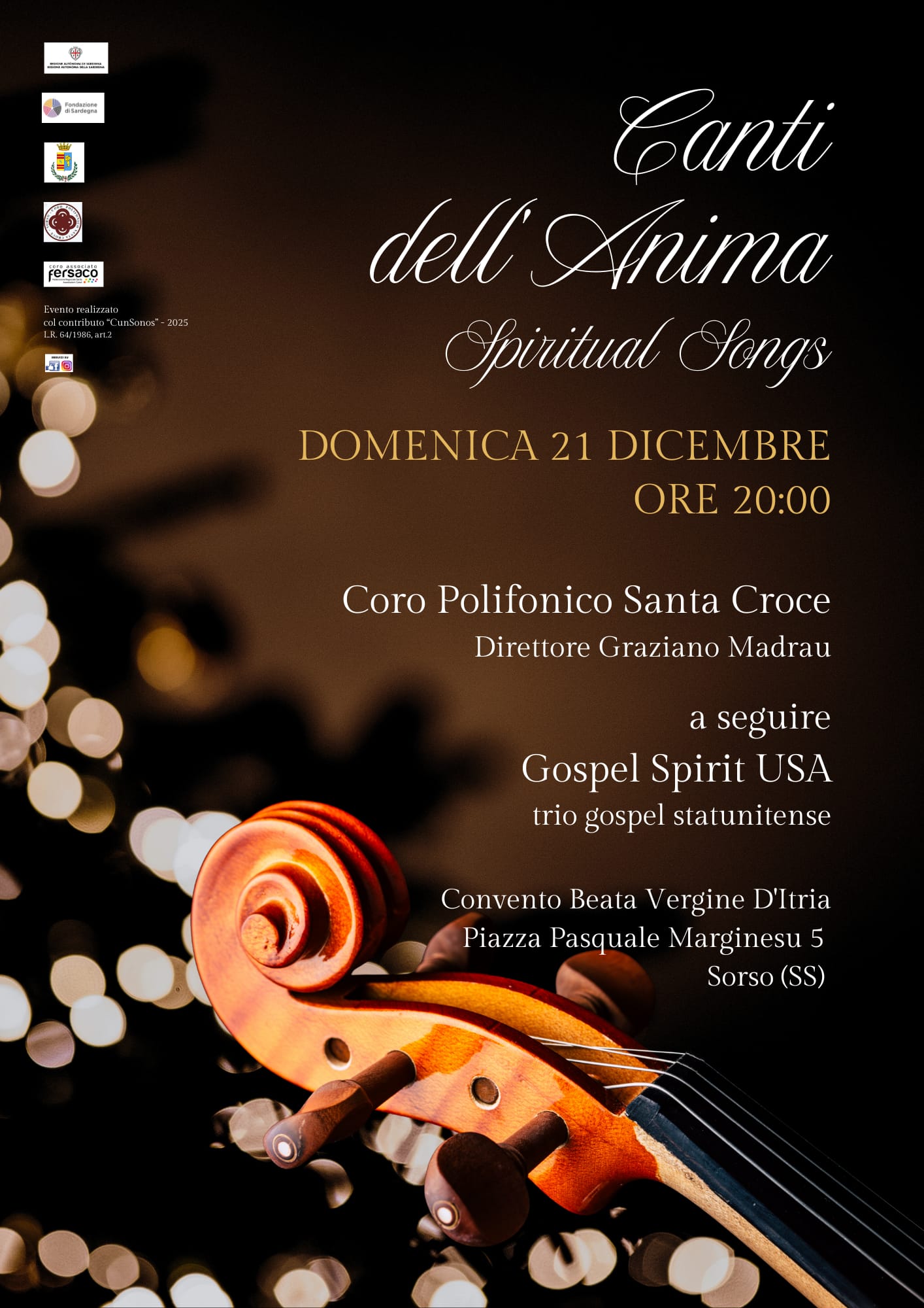 Natale in Romangia: domenica 21 dicembre, nel Convento della Beata Vergine d’Itria, in Piazza Marginesu, serata di “Canti dell’Anima-Spiritual Songs”, con il Coro polifonico Santa Croce, diretto dal maestro Graziano Madrau, e il trio gospel statunitense Gospel Spirit USA.