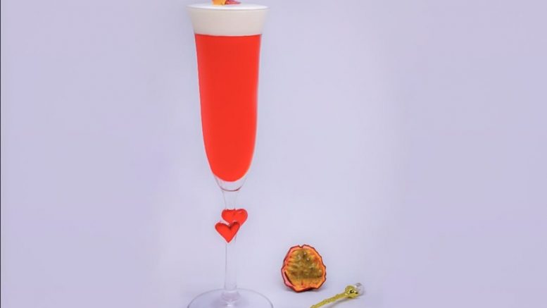 Dario Olmeo è partito da una base alcolica di vodka liscia, a questa ha aggiunto liquore rosolio di violetta, shrub alle fragole frutto della passione, succo al pompelmo rosa e come top velluto di Biancosarti e fiori commestibili. Per completare il cocktail, il barchef algherese ha scelto un side innovativo composto da una capsula di alginato, alcolica, al maracuja e lychee.