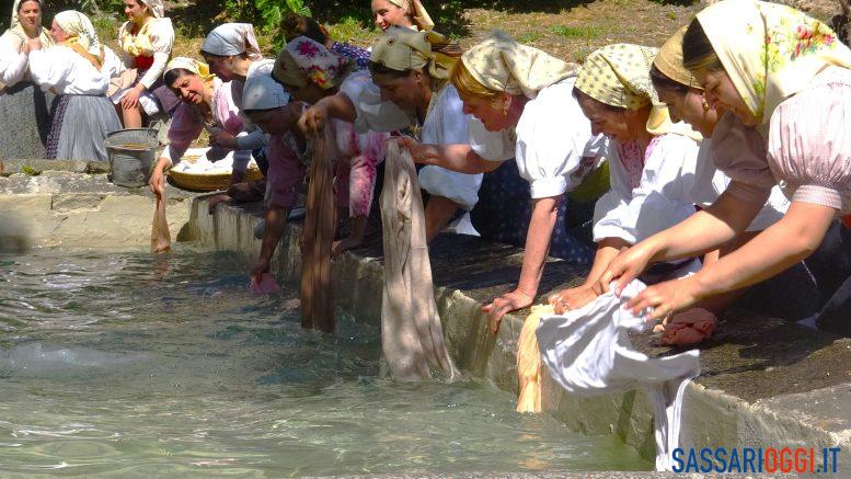 Di primo mattino le massaie hanno iniziato a lavare di buona lena, mentre i mariti, dopo aver tosato le pecore, hanno iniziato a scaldare i pentoloni dove poi questa lana veniva immersa e cardata. La giornata soleggiata ha accompagnato il vociare delle massaie che tra loro si scambiavano pareri sui due sposini. Mentre nei paiuoli, la lana continuava la bollitura. In questo luogo identitario pieno di ricordi, anche gli spettatori hanno fatto parte di un film. Dopo la tosatura e la bollitura, la lana è stata lavata nelle vasche dalle massaie e stesa ad asciugare. Dopo questo ultimo passaggio, e quindi finito il lavoro, tutta la comunità proseguiva i festeggiamenti con pecora bollita, rosolio e il meritato riposo. Un pranzo conviviale, accompagnato da canti e balli dell’epoca state curate da Radio Club Coros- Museo della Radio Mario Faedda.