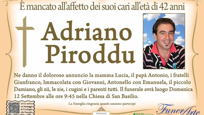 Ne danno il doloroso annuncio la mamma Lucia, il papà Antonio, i fratelli Gianfranco, Immacolata con Giovanni, Antonello con Emanuela, il piccolo Damiano, gli zii, le zie e i parenti tutti.