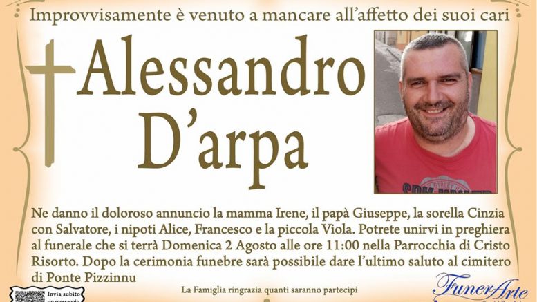 Ne danno il doloroso annuncio la mamma Irene, il papà Giuseppe, la sorella Cinzia con Salvatore, i nipoti Alice, Francesco e la piccola Viola. Potete unirvi in preghiera al funerale che si terrà domenica 2 agosto alle ore 11 nella parrocchia di Cristo Risorto a Porto Torres. Dopo la cerimonia funebre sarà possibile dare l’ultimo saluto al cimitero di Ponte Pizzinnu.
