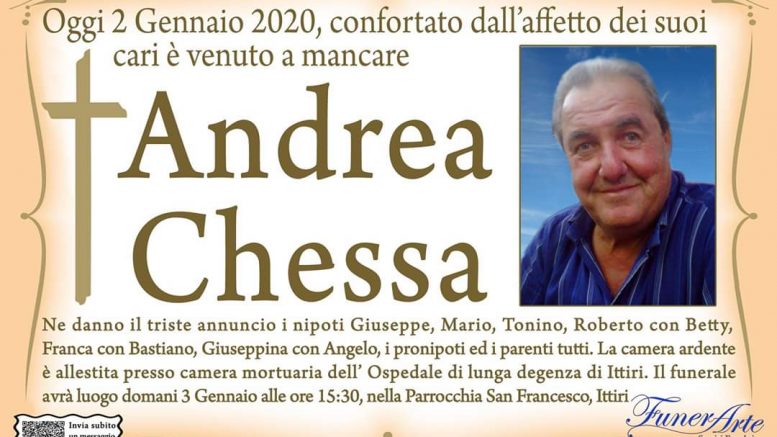 Ne danno il triste annuncio i nipoti Giuseppe, Mario, Tonino, Roberto con Betty, Franca con Bastiano, Giuseppina con Angelo, i pronipoti ed i parenti tutti. La camera ardente è allestita presso la Camera mortuaria dell’ospedale di lunga degenza di Ittiri. Il funerale avrà luogo domani 3 gennaio alle ore 15:30 nella parrocchia di San Francesco a Ittiri.